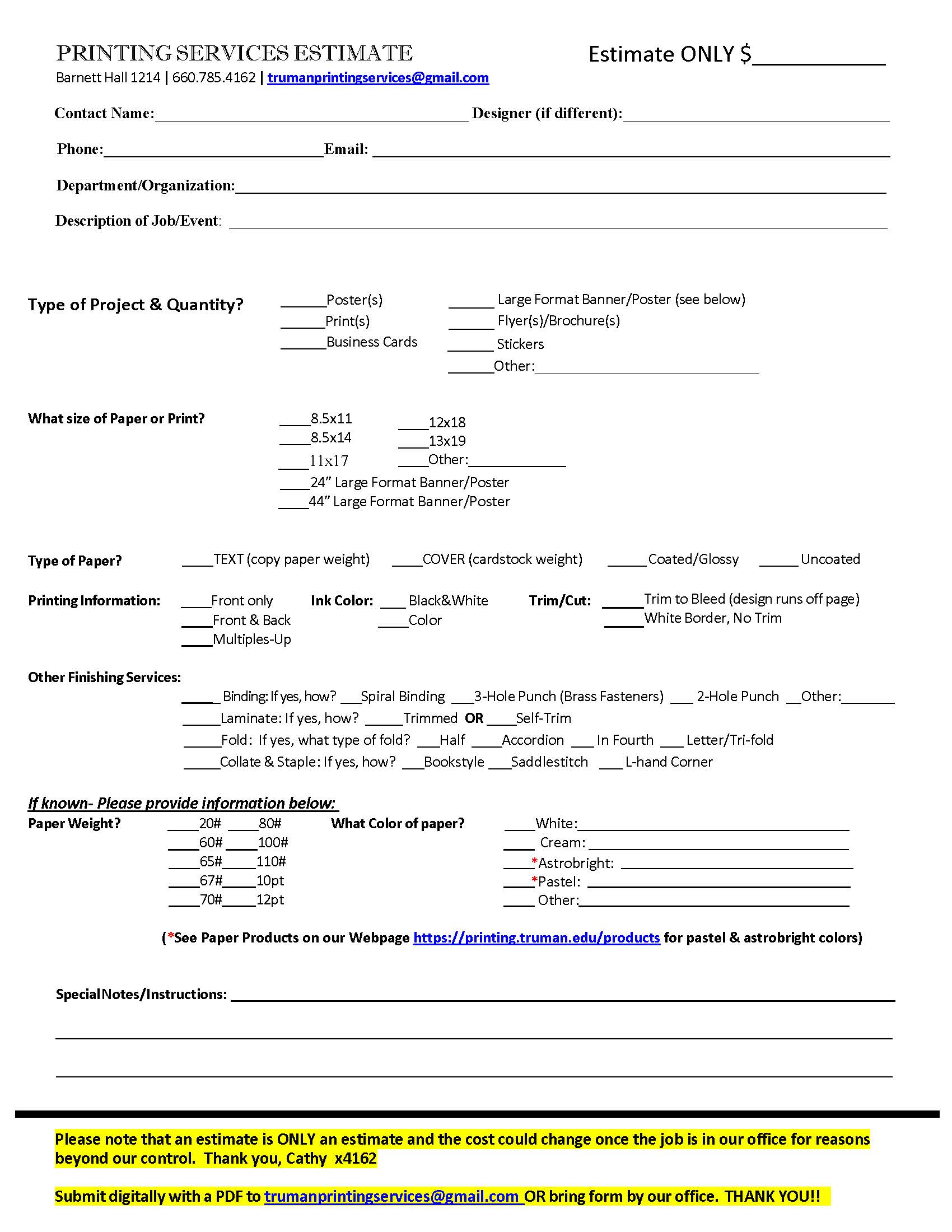 Email the Estimate Request to trumanprintingservices@gmail.com, along with PDF file.